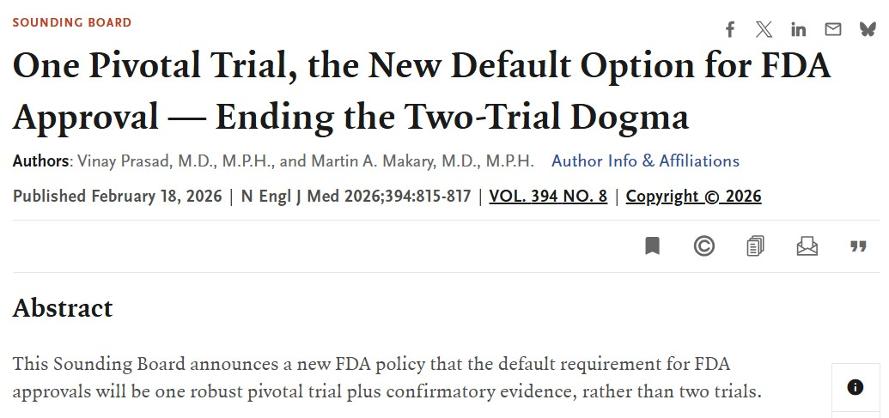 [메디게이트뉴스 박도영 기자] 미국 식품의약국(FDA) 고위 관계자들이 신약을 승인하기 위해 필요한 확증 임상시험을 최소 2개에서 1개로 줄이겠다는 입장을 밝히면서 향후 실제 적용 기준이 어떻게 나올지 업계의 관심이 쏠리고 있다. 이는 단순한 완화 조치라기보다, 임상 설계의 과학적 타당성과 생물학적 개연성을 중심으로 허가 판단을 내리겠다는 구조적 전환으로 해석해야 하며, 공식화될 시 바이오 업계는 임상시험 '개수 전략'에서 '설계 경쟁력'으로 변화를 줘야 한다는 지적도 나온다.
