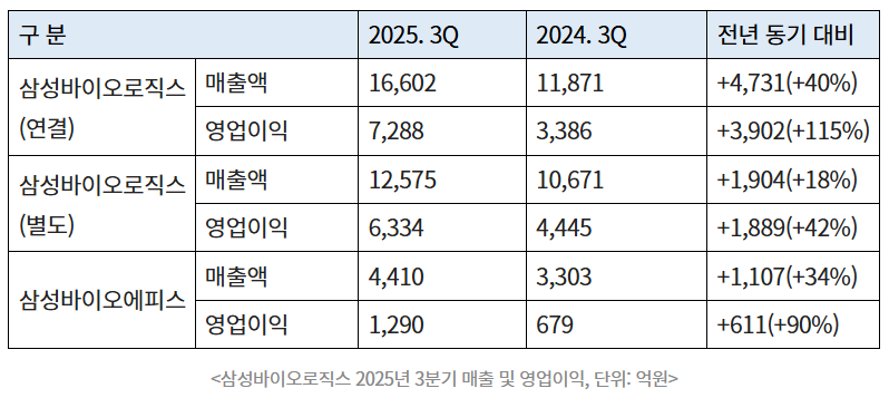 삼성바이오로직스는 28일 공시를 통해 2025년 3분기 연결기준 매출 1조6602억원, 영업이익 7288억원을 기록했다고 밝혔다. 전년 동기 대비 매출은 4731억원, 영업이익은 3902억원 증가했다.