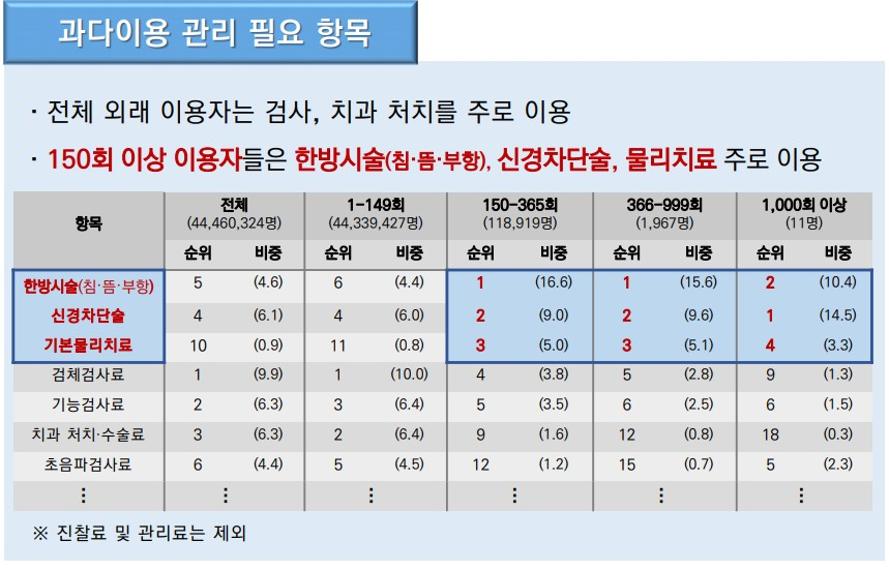 특히 상위 이용군에서는 특정 시술에 대한 쏠림 현상이 두드러졌다. 한방시술(침·뜸·부항), 신경차단술, 물리치료가 주요 이용 항목으로 꼽혔으며, 150~365회 구간에서는 한방시술 비중이 16.6%로 가장 높았고 신경차단술(9.0%), 기본 물리치료(5.0%)가 뒤를 이었다.