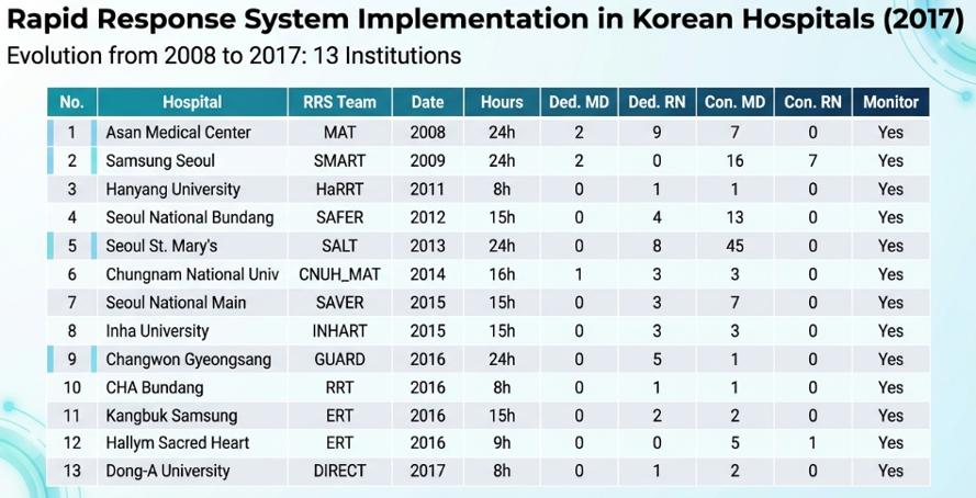 반면, K-RRS는 인력 소모, 과다경보, 전담 인력 부재라는 한계를 동시에 안고 있다. 다수 병원에서 RRS는 24시간 운영되지 않으며, 의료진이 중환자실 진료와 RRS 업무를 병행하는 구조가 일반적이다.