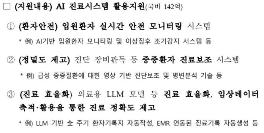 이외에도 권역책임의료기관 내 환자 편의를 위한 실시간 통역 서비스, AI 상담 및 알람서비스 등 환자 편의 제공 및 운영 효율화를 위한 다양한 AI 기반 시스템 도입도 지원 대상에 포함된다.