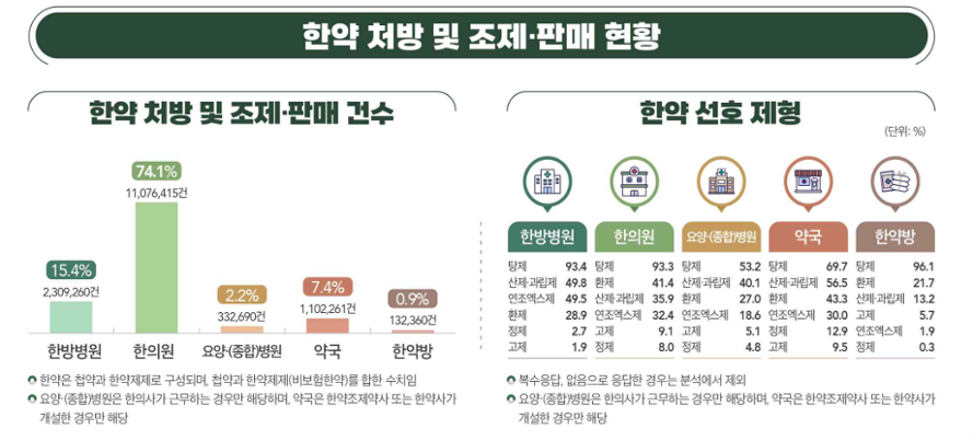 조사 결과, 한방병원의 첩약 처방 가운데 84.7%, 한의원은 77.3%가 질환 치료 목적이었으며, 건강증진·미용 목적은 각각 13.9%, 21.1%로 나타났다.