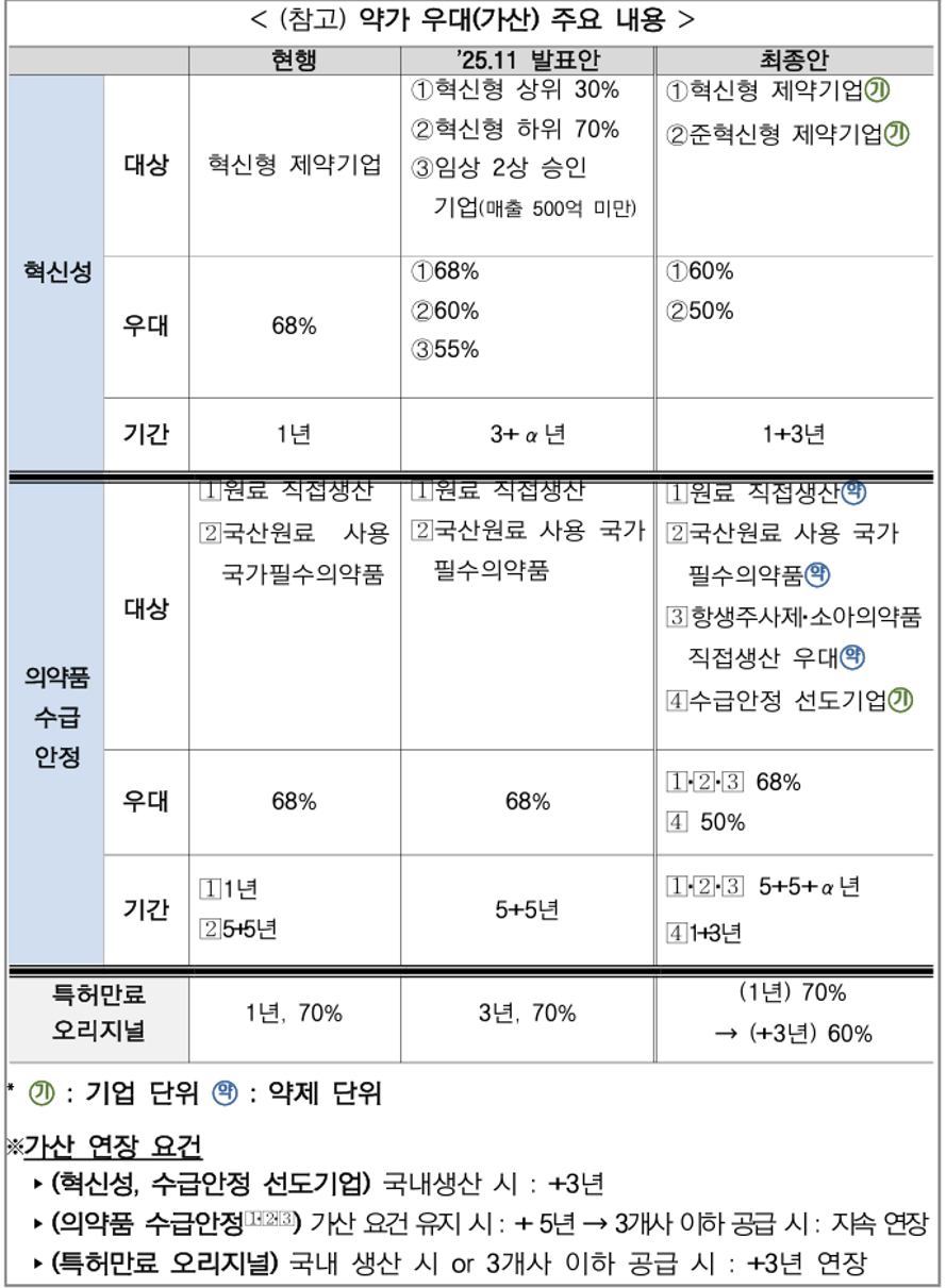 아울러 혁신형 제약기업에는 약가 가산 60%를 최대 4년간 보장하고 사후관리 특례를 강화한다. 이에 더해 '준혁신형 제약기업'을 신설해 약가 가산 50%를 최대 4년간 부여한다. 혁신형·준혁신형 제약기업에는 약가 산정체계 개편에 따른 기존 의약품 약가 조정 시 한시적 특례가 적용된다.