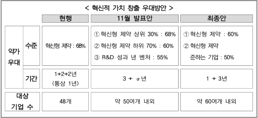 혁신형 제약기업과 준혁신형 제약기업에는 각각 49%, 47%의 특례 수준 약가로 조정한 후 특례기간(각 4년·3년)을 부여한다.