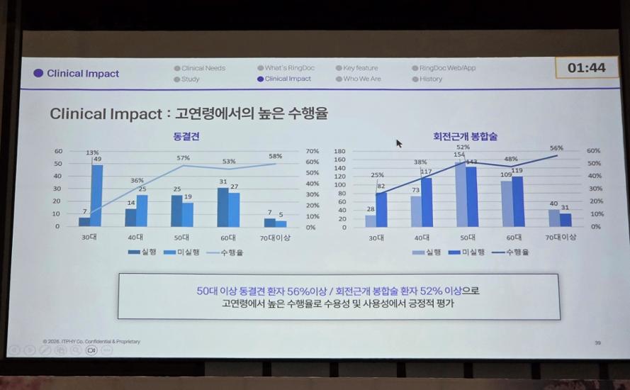 임 교수는 프로토타입을 개념검증(POC)하는 과정에서 치료 중 환자의 보상 움직임과 얼굴 표정, 자세 변화까지 함께 살펴봐야 한다는 점을 확인했다고 밝혔다. 이뿐 아니라 20분 정도 치료했을 때 3가지 운동 범위가 각각 20도씩 증가하는 것을 확인했고, 이런 경험을 통해 로봇이 단순히 움직이는 장비가 아니라 실제 치료 흐름 안에서 작동해야 한다는 점을 인지했다고 부연했다.