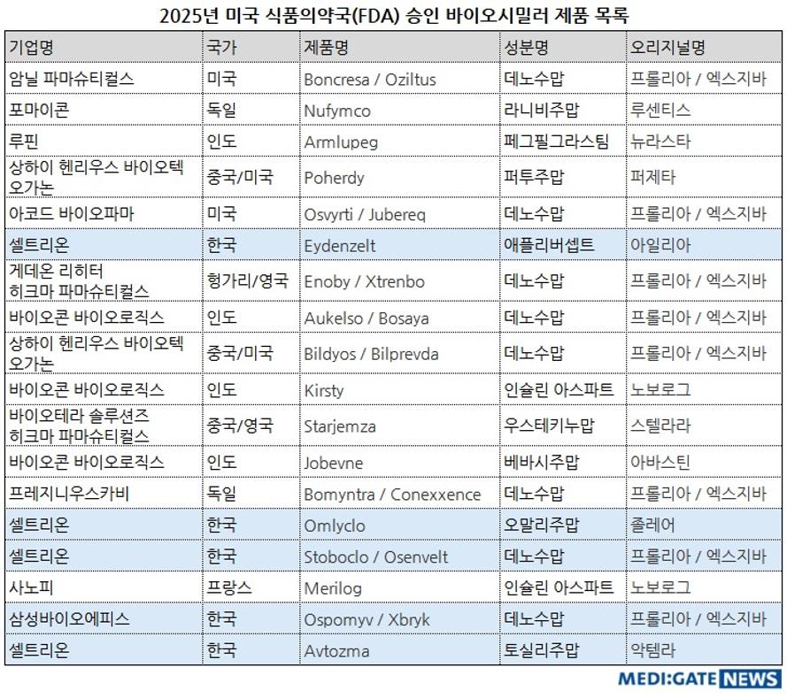 28일 관련업계에 따르면 2025년 FDA는 바이오시밀러 제품으로 ▲셀트리온의 앱토즈마(Avtozma) ▲삼성바이오에피스의 오스포미브(Ospomyv)/엑스브릭(Xbryk) ▲사노피의 메릴로그(Merilog) ▲셀트리온의 스토보클로(Stoboclo)/오센벨트(Osenvelt) ▲셀트리온의 옴리클로(Omlyclo) ▲프레지니우스카비의 보민트라(Bomyntra)/코넥센스(Conexxence) ▲바이오콘의 조베브네(Jobevne) ▲바이오테라의 스타젬자(Starjemza) ▲바이오콘의 커스티(Kirsty) ▲헨리우스/오가논의 빌디오스(Bildyos)/빌프레브다(Bilprevda) ▲바이오콘의 보사야(Bosaya)/아우켈소(Aukelso) ▲히크마의 에노비(Enoby)/엑스트렌보(Xtrenbo) ▲셀트리온의 아이덴젤트(Eydenzelt) ▲아코드의 오스비티(Osvyrti)/주베렉(Jubereq) ▲헨리우스/오가논의 포허디(Poherdy) ▲루핀의 암루페그(Armlupeg) ▲포마이콘의 누핌코(Nufymco) ▲암닐의 본크레사(Boncresa)/오질투스(Oziltus)를 허가했다.