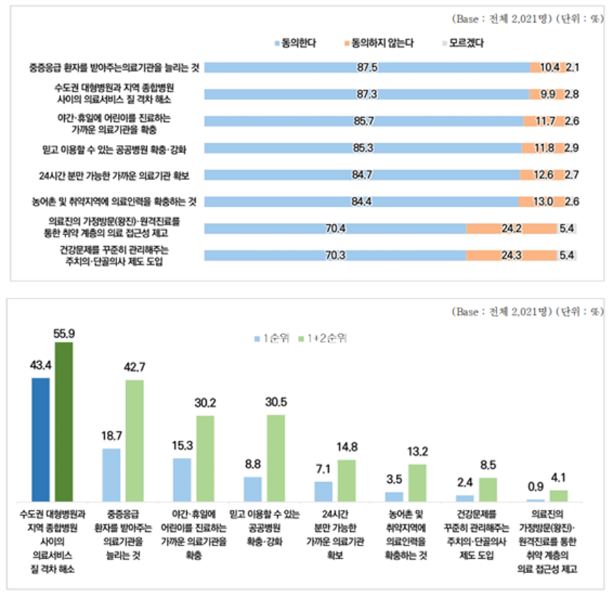 의료 서비스에 대한 인식 조사에서는 취약지가 아닌 지역보다 의료 취약지에서 지역 내 의료기관이 충분하다고 인식하는 수준이 매우 낮은 것으로 드러났다. 그 결과 수도권 대형병원과 지역 종합병원 사이의 의료 서비스 질 격차 해소가 중요도(87.5%)와 시급성(43.4%) 모두 가장 높은 최우선 개선 필요 과제로 꼽혔다.