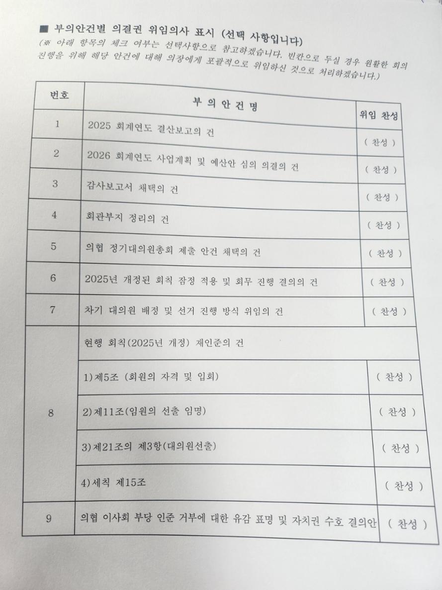 민주적 회무를 염원하는 경기도의사회 대의원 모임은 26일 성명을 통해 "선택권 없는 위임장은 대의원의 양심을 강요하는 도구"라며 "반대 서명 칸조차 없는 위임장은 민주적인 의사결정 수단이 아니라, 특정 세력의 권력을 정당화하기 위한 요식 행위에 불과하다"고 지적했다.