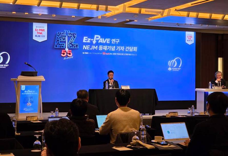 6일 유한양행이 웨스틴조선호텔 서울, 오키드 룸에서 개최한 'Ez-Pave 연구에 대한 국제학술지 NEJM(New England Journal of Medicine) 등재 기념 기자간담회'에서 연세대 세브란스병원 김병극 교수(심장내과)와 이용준 교수(심장내과)가 Ez-Pave 연구 결과를 발표했다.