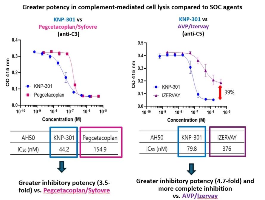 KNP-301은 습성 황반변성 표준치료제인 Eylea(aflibercept) 및 Vabysmo(faricimab)과 동등한 수준의 억제 효능을 보였으며, 보체 대체경로 용혈 분석에서는 지도모양위축 표준치료제인 Syforvere(pegcetacoplan) 및 Izervay(avacincaptad pegol) 대비 더 강한 억제 활성을 확인했다. 특히 IC50(50% 억제농도) 값은 Syforvre 대비 약 3.5배, Izervay 대비 약 4.7배 낮게 나타나, 보체 억제 효능을 보였다.