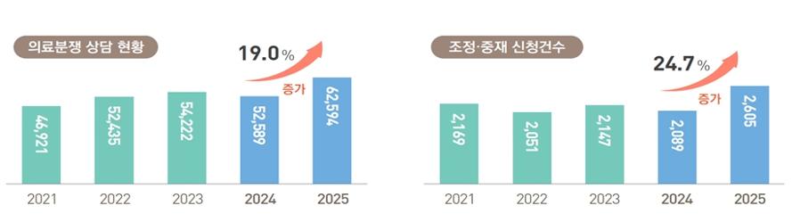 특히 실제 의료분쟁 조정·중재 접수 건수도 최근 5개년 중 최대치인 2605건을 기록해 전년 대비 24.7% 급증했다.