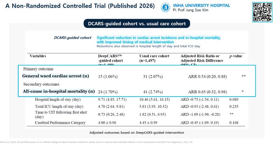 지난 1월에는 인하대병원 호흡기내과 김정수 교수팀이 이끈 딥카스 최초의 전향적 중재연구가 국제 전문 학술지 다이아그노틱스(Diagnostics)에 게재됐다. 연구팀은 일반병동에 입원한 성인환자 3만6797명을 대상으로 1년간 전향적으로 연구를 수행했다. 전체 입원 환자 중 알람이 발생한 환자 2906명을 두 그룹으로 나눴다. 중재군은 딥카스 알람이 발생한 환자 중 24시간 이내 임상 재평가나 치료가 이뤄진 그룹, 대조군은 해당 시간 내 알람에 대해 추가 대응을 하지 않은 그룹으로 임상 결과를 비교 분석했다.