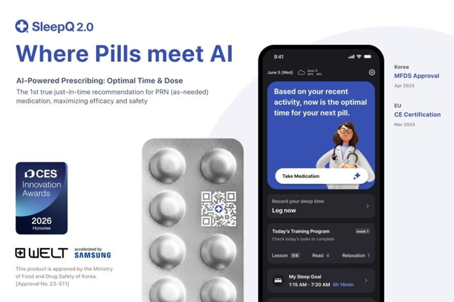 웰트(G506)는 국내 디지털치료기기 시장을 선도해 온 기업이다. 지난 2016년 삼성전자에서 스핀오프해 설립됐으며, 2023년 불면증 디지털치료기기 ‘슬립큐(SleepQ)’의 허가를 획득했다. 이번 키메스에서는 슬립큐 2.0을 선보일 예정이다. 슬립큐 2.0에 탑재할 AI 기반 복약 타이밍 플랫폼 ‘AgentZ’은 CES 2026에서 혁신상을 수상한 바 있다. 이 기술은 예측 엔진이 사용자의 수면 행동, 생리적 신호, 스트레스 변화, 생활 페턴 등을 분석해 가장 치료 효과가 높고 부작용 위험이 낮은 수면 약물 복용 타이밍을 개인화해 제공한다.