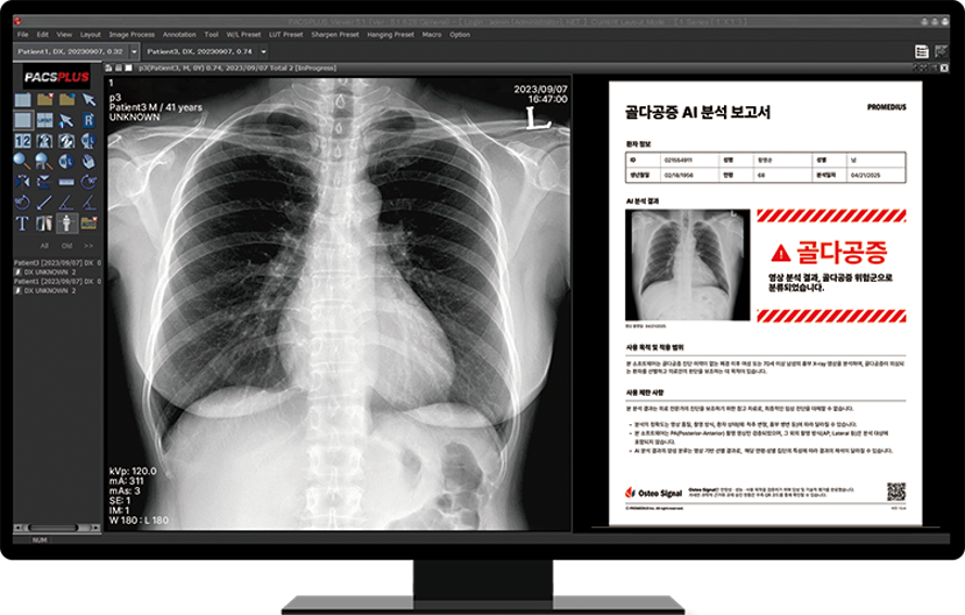 프로메디우스(G201)는 서울아산병원 의료영상 지능 실현 연구실에서 스핀오프한 의료 AI 스타트업으로, 흉부 X-ray 영상만으로 골다공증 위험을 선별하는 AI 소프트웨어 ‘Osteo Signal’을 개발했다. 해당 솔루션은 PACS와 연동해 추가 검사 없이 골다공증 가능성을 분석해 의료진의 진단을 보조하며, 조기 발견과 골절 예방을 목표로 한다. 2025년 평가유예 신의료기술로 선정되며 국내 사업화에 박차를 가하고 있다.